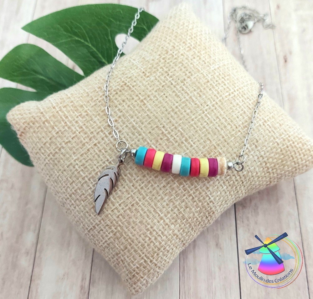 Perles rondelles en pierres teintées et petite pentif plume en acier inoxydable