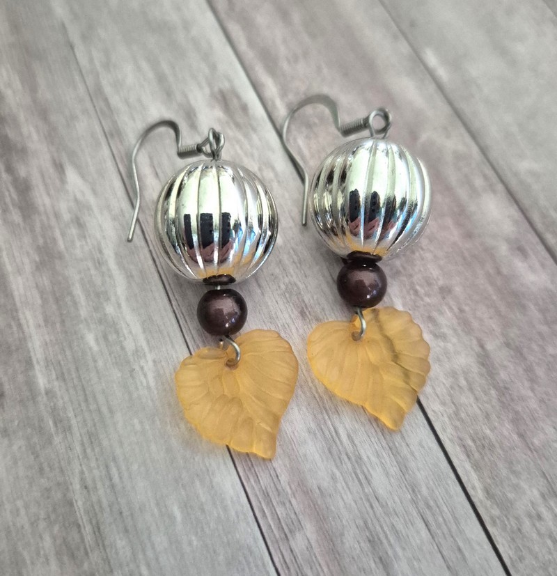 - Perle acrylique argenté et petite perle marron , feuille orange acrylique