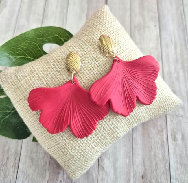 Boucles d'oreilles acryliques feuilles de ginkgo rouges et clou acier inoxydable plaqué or