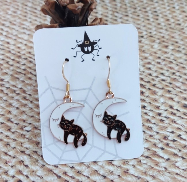 Boucles d'oreilles Halloween - chat - croissant de lune - crochets en acier inoxydable doré