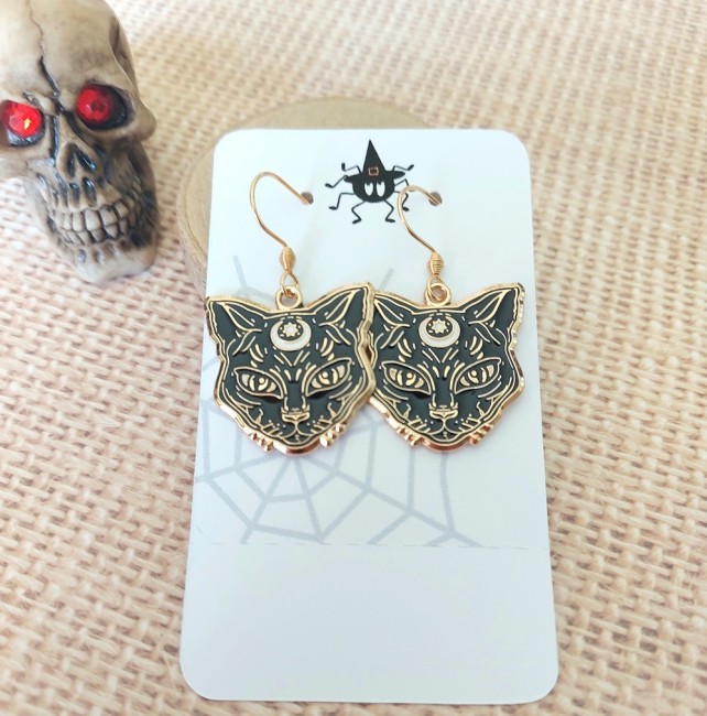 Boucles d'oreilles Halloween - têtes de chats - crochets en acier inoxydable doré
