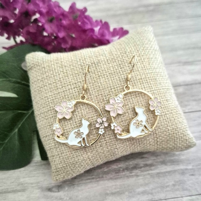 Boucles d'oreilles chats - fleurs de cerisiers , crochets acier inoxydable